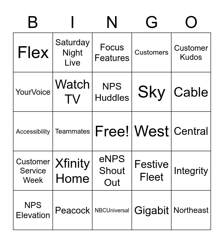 This bingo card has a free space and 39 words: Xfinity, xFi, Voice Remote, Watch TV, NPS Elevation, eNPS Shout Out, NPS Huddles, NPS Callbacks, Customer Kudos, Customer Service Week, Teammates, Customers, Northeast, Central, West, Xfinity Home, Xfinity Mobile, Flex, My Account, Festive Fleet, YourVoice, NBCUniversal, Sky, Cable, Innovation, Entertainment, Media, 1963, The Tonight Show, Saturday Night Live, Comcast Cares Day, Comcast Business, Focus Features, Peacock, Gigabit, Internet Essential, Integrity, Accessibility and Listen, Learn, Act.