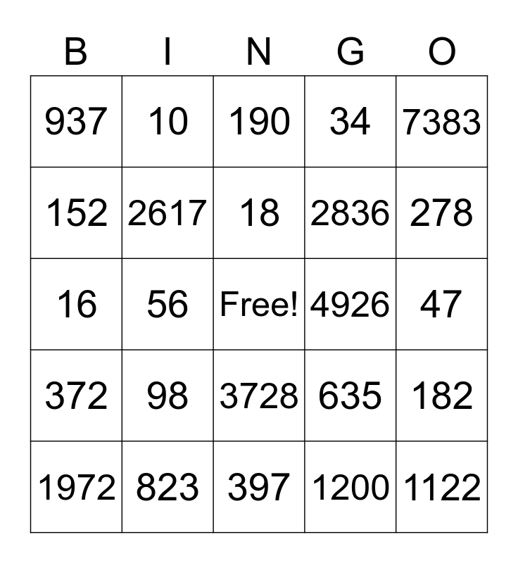 This bingo card has a free space and 24 words: 98, 823, 18, 1972, 7383, 937, 152, 10, 4926, 3728, 2836, 16, 635, 182, 2617, 1200, 47, 190, 278, 56, 1122, 372, 34 and 397.