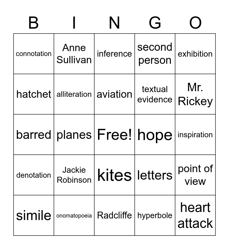 This bingo card has a free space and 26 words: kites, hyperbole, aviation, onomatopoeia, exhibition, connotation, hatchet, Anne Sullivan, inspiration, letters, textual evidence, barred, point of view, simile, planes, personification, second person, denotation, inference, heart attack, Mr. Rickey, Radcliffe, hope, Jackie Robinson, alliteration and imagery.