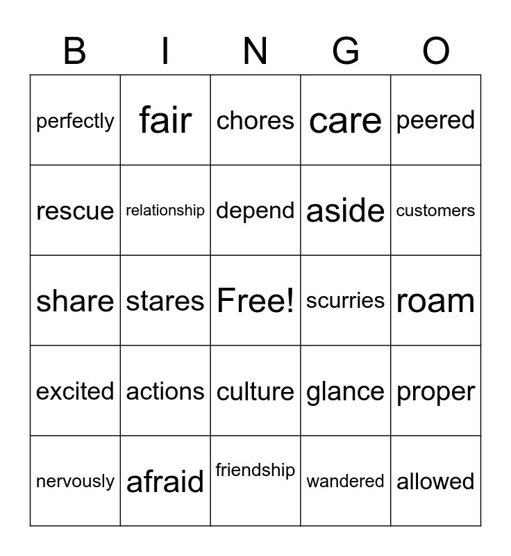 This bingo card has a free space and 24 words: actions, afraid, depend, nervously, peered, perfectly, rescue, fair, scurries, culture, aside, share, glance, proper, relationship, wandered, roam, chores, customers, stares, allowed, excited, care and friendship.