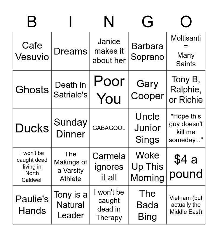 This bingo card has a free space and 24 words: The Makings of a Varsity Athlete, Tony is a Natural Leader, Poor You, Paulie's Hands, Moltisanti = Many Saints, Cafe Vesuvio, Ghosts, Dreams, Uncle Junior Sings, Carmela ignores it all, Gary Cooper, Ducks, Woke Up This Morning, $4 a pound, Death in Satriale's, The Bada Bing, "Hope this guy doesn't kill me someday...", Janice makes it about her, Tony B, Ralphie, or Richie, Sunday Dinner, Vietnam (but actually the Middle East), I won't be caught dead living in North Caldwell, Barbara Soprano and I won't be caught dead in Therapy.
