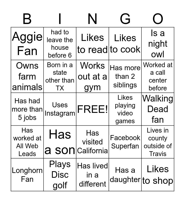 This bingo card has a free space and 24 words: Has a son, Plays Disc golf, Works out at a gym, Longhorn Fan, Is a night owl, Aggie Fan, Owns farm animals, had to leave the house before 6, Likes playing video games, Has visited California, Has more than 2 siblings, Has had more than 5 jobs, Facebook Superfan, Lives in county outside of Travis, Born in a state other than TX, Has a daughter, Walking Dead fan, Likes to read, Worked at a call center before, Uses Instagram, Likes to shop, Has worked at All Web Leads, Likes to cook and Has lived in a different.