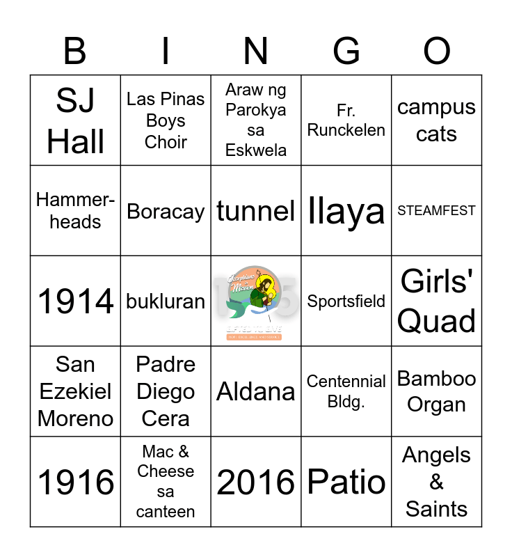 This bingo card has a free space and 24 words: Padre Diego Cera, Mac & Cheese sa canteen, tunnel, 1916, campus cats, SJ Hall, Hammer- heads, Las Pinas Boys Choir, Sportsfield, Aldana, Ilaya, 1914, Centennial Bldg., Bamboo Organ, Boracay, Patio, Girls' Quad, Araw ng Parokya sa Eskwela, STEAMFEST, bukluran, Angels & Saints, San Ezekiel Moreno, Fr. Runckelen and 2016.