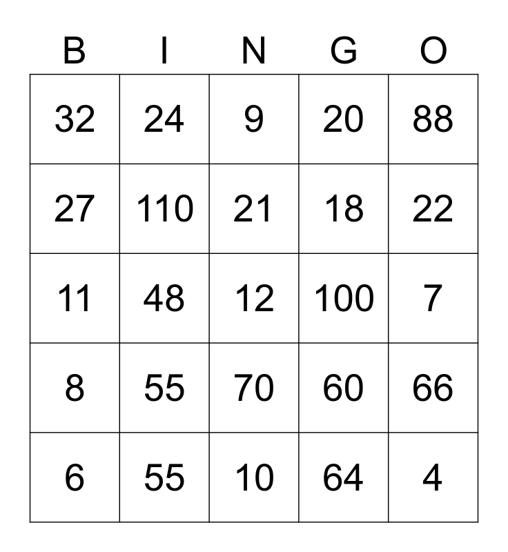 This bingo card has 51 words: 25, 12, 8, 10, 55, 16, 24, 54, 27, 77, 110, 20, 66, 60, 72, 14, 21, 100, 90, 88, 48, 64, 32, 18, 121, 4, 22, 3, 6, 9, 15, 45, 98, 36, 40, 55, 35, 30, 27, 62, 7, 8, 9, 5, 6, 3, 11, 33, 44, 70 and 55.