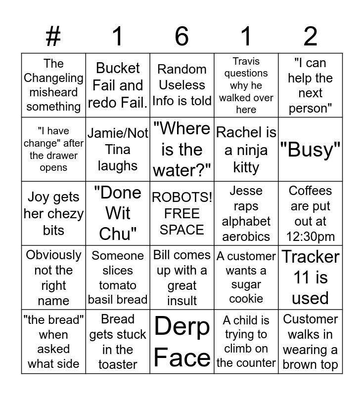 This bingo card has a free space and 24 words: Someone slices tomato basil bread, Bread gets stuck in the toaster, "Where is the water?", "the bread" when asked what side, "I can help the next person", The Changeling misheard something, "I have change" after the drawer opens, Bucket Fail and redo Fail., Jesse raps alphabet aerobics, Bill comes up with a great insult, Rachel is a ninja kitty, Joy gets her chezy bits, A customer wants a sugar cookie, Tracker 11 is used, Jamie/Not Tina laughs, A child is trying to climb on the counter, Coffees are put out at 12:30pm, Random Useless Info is told, "Busy", "Done Wit Chu", Customer walks in wearing a brown top, Obviously not the right name, Travis questions why he walked over here and Derp Face.