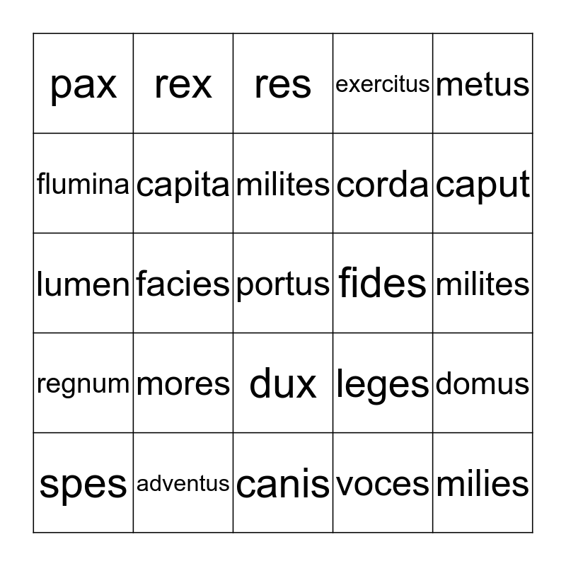 This bingo card has a free space and 24 words: mores, adventus, milites, spes, metus, pax, flumina, rex, fides, dux, corda, lumen, leges, domus, capita, voces, milites, res, caput, facies, milies, regnum, exercitus and canis.