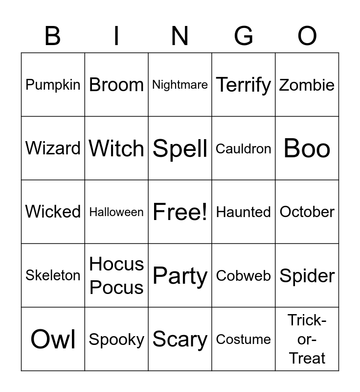 This bingo card has a free space and 31 words: Scary, Ghost, Halloween, Vampire, Pumpkin, Nightmare, Witch, Cobweb, Haunted, Costume, October, Trick-or-Treat, Haunt, Creepy, Boo, Evil, Spider, Hocus Pocus, Skeleton, Party, Zombie, Potion, Owl, Broom, Cauldron, Wizard, Terrify, Wicked, Spooky, Spell and Hwol.