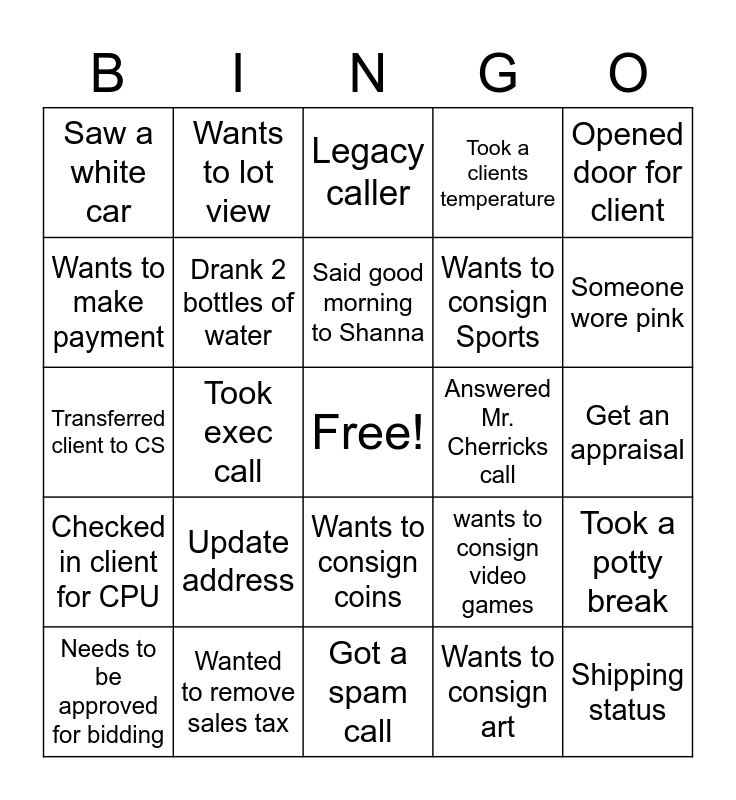 This bingo card has a free space and 24 words: Update address, Wanted to remove sales tax, Said good morning to Shanna, Needs to be approved for bidding, Opened door for client, Saw a white car, Wants to make payment, Wants to lot view, Answered Mr. Cherricks call, Wants to consign coins, Wants to consign Sports, Transferred client to CS, wants to consign video games, Took a potty break, Drank 2 bottles of water, Wants to consign art, Get an appraisal, Legacy caller, Someone wore pink, Took exec call, Shipping status, Checked in client for CPU, Took a clients temperature and Got a spam call.