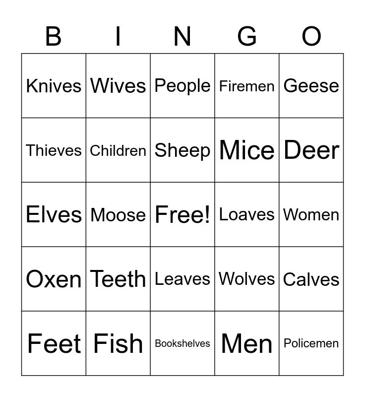This bingo card has a free space and 24 words: Teeth, Fish, Sheep, Feet, Geese, Knives, Thieves, Wives, Loaves, Leaves, Mice, Elves, Wolves, Calves, Children, Men, Women, People, Deer, Moose, Policemen, Oxen, Firemen and Bookshelves.