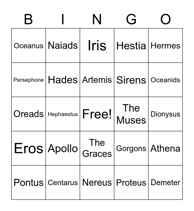 This bingo card has a free space and 37 words: Zeus, Hera, Poseidon, Hades, Athena, Apollo, Artemis, Aphrodite, Hermes, Ares, Hephaestus, Hestia, Demeter, Dionysus, Persephone, Eros, Hebe, Iris, The Graces, The Muses, Oceanus, Oceanids, Pontus, Nereus, Triton, Proteus, Naiads, Pan, Silenus, Castor & Pollux, Satyrs, Centarus, Oreads, Dryads, Gorgons, Sirens and Fates.
