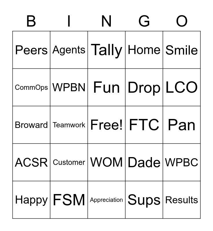This bingo card has a free space and 25 words: Customer, Appreciation, Fun, Happy, Smile, Peers, CommOps, Agents, FTC, WOM, Drop, Broward, Dade, WPBC, WPBN, JAX, Pan, Tally, LCO, Teamwork, Results, FSM, ACSR, Home and Sups.