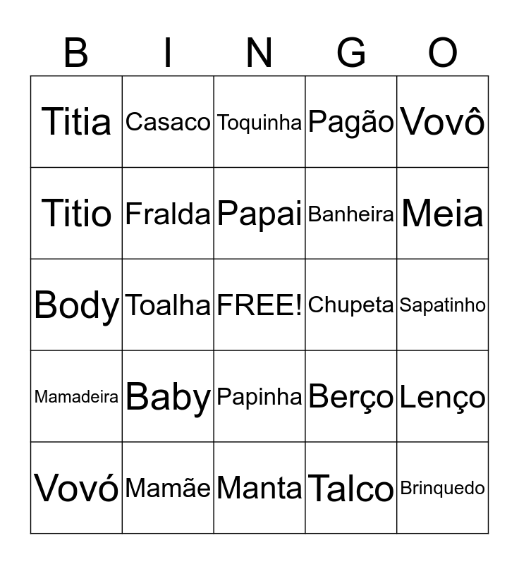 This bingo card has a free space and 24 words: Baby, Mamãe, Papai, Vovó, Vovô, Titia, Titio, Casaco, Chupeta, Papinha, Banheira, Body, Berço, Lenço, Fralda, Talco, Sapatinho, Toquinha, Meia, Toalha, Brinquedo, Mamadeira, Pagão and Manta.