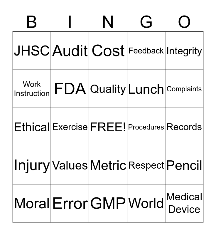 This bingo card has a free space and 24 words: Values, Error, Quality, Moral, Integrity, JHSC, Work Instruction, Audit, Procedures, Metric, Lunch, Ethical, Respect, Pencil, FDA, World, Records, Cost, Complaints, Exercise, Medical Device, Injury, Feedback and GMP.