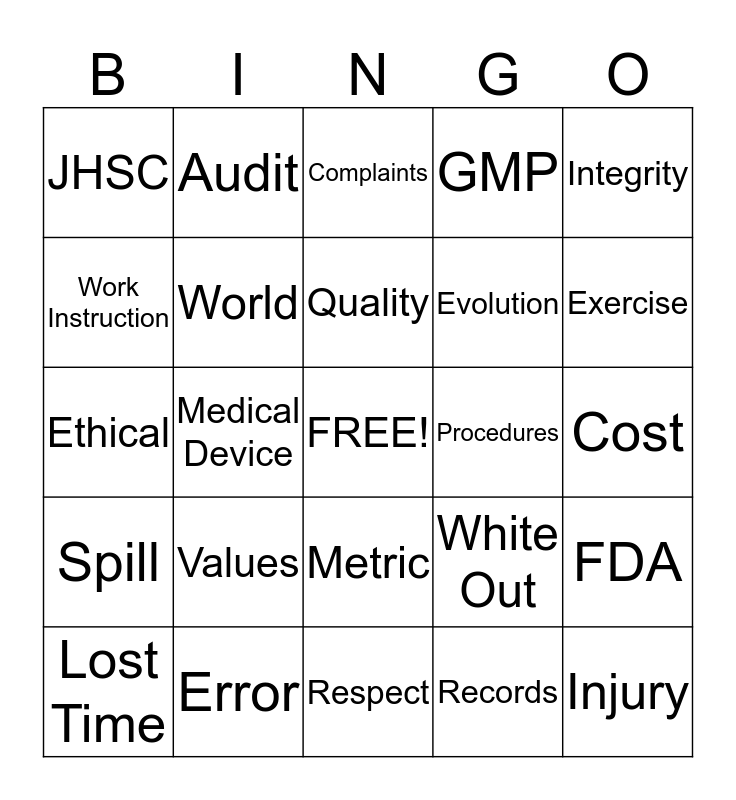 This bingo card has a free space and 24 words: Values, Error, Quality, Lost Time, Integrity, JHSC, Work Instruction, Audit, Procedures, Metric, Evolution, Ethical, White Out, FDA, World, Records, Cost, Complaints, Exercise, Medical Device, Injury, Spill, GMP and Respect.