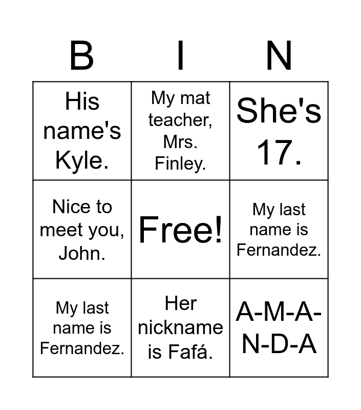 ⚠ This card has duplicate items: Nice to meet you, too. (2), I'm Anne. (2), Her name's Joana. (2), His name's Kyle. (2), Good morning! (2), Hello! (2), My last name is Fernandez. (2), His last name is Galveston. (2), Her last name is Morales. (2), Good afternoon! (2), Nice to meet you, John. (2), My science teacher, Mr. Sarandon. (2), My mat teacher, Mrs. Finley. (2), Bye-bye. (2), A-M-A-N-D-A (2), M-A-R-T-I-N-E-Z (2), I'm from Canada. (2), John is from Spain. (2), Gina is from Brazil. (2), I'm 13. (2), He's 14. (2), She's 17. (2), My nickname is Mimi. (2), Her nickname is Fafá. (2), His nickname is Peu. (2)