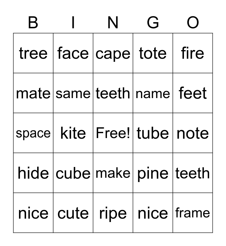 This bingo card has a free space and 24 words: cube, cute, teeth, nice, fire, tree, mate, face, tube, make, name, space, pine, teeth, same, nice, note, cape, feet, kite, frame, hide, tote and ripe.