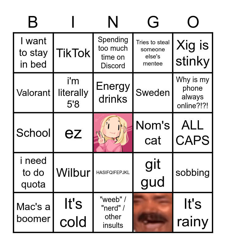 This bingo card has 1 images, a free space and 23 words: Wilbur, It's cold, Energy drinks, Mac's a boomer, Xig is stinky, I want to stay in bed, Valorant, TikTok, Nom's cat, HASIFQIFEPJKL, Sweden, School, git gud, sobbing, i'm literally 5'8, ALL CAPS, Spending too much time on Discord, Why is my phone always online?!?!, ez, It's rainy, i need to do quota, Tries to steal someone else's mentee and "weeb" / "nerd" / other insults.