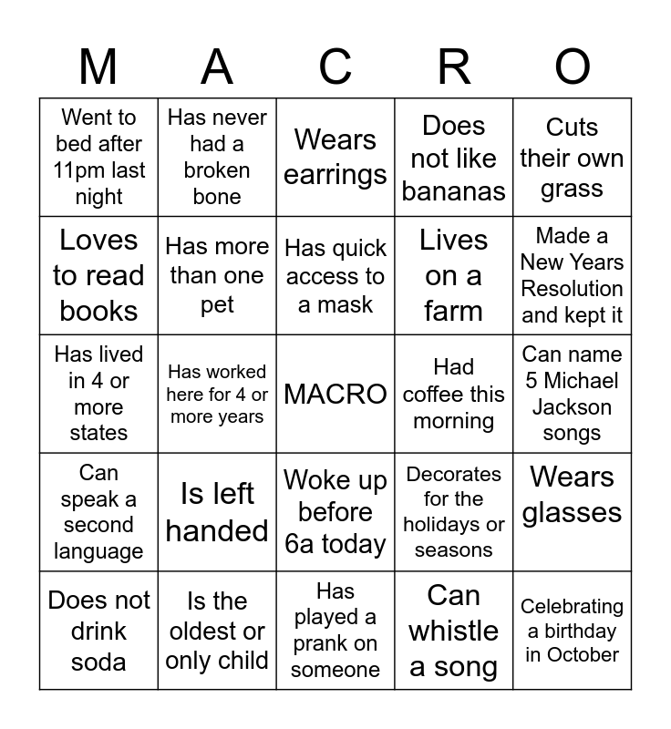 This bingo card has a free space and 29 words: Does not drink soda, Sings in the shower ot bathtub, Has worked here for 4 or more years, Plays a musical instrument, Went to bed after 11pm last night, Wears earrings, Has more than one pet, Is left handed, Had coffee this morning, Is the oldest or only child, Can name 5 Michael Jackson songs, Celebrating a birthday in October, Has played a prank on someone, Can whistle a song, Made a New Years Resolution and kept it, Can name all 7 dwarfs, Woke up before 6a today, Can speak a second language, Cuts their own grass, Has lived in 4 or more states, Decorates for the holidays or seasons, Enjoys camping, Lives on a farm, Loves to read books, Does not like bananas, Has never had a broken bone, Wears glasses, Has quick access to a mask and Can recite the pledge of allegiance.
