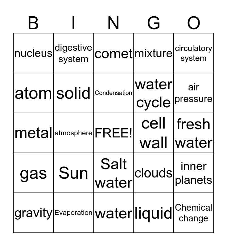 This bingo card has a free space and 24 words: Sun, Evaporation, Condensation, gravity, circulatory system, nucleus, atom, digestive system, cell wall, Salt water, water cycle, metal, clouds, inner planets, solid, liquid, fresh water, comet, air pressure, atmosphere, Chemical change, gas, mixture and water.