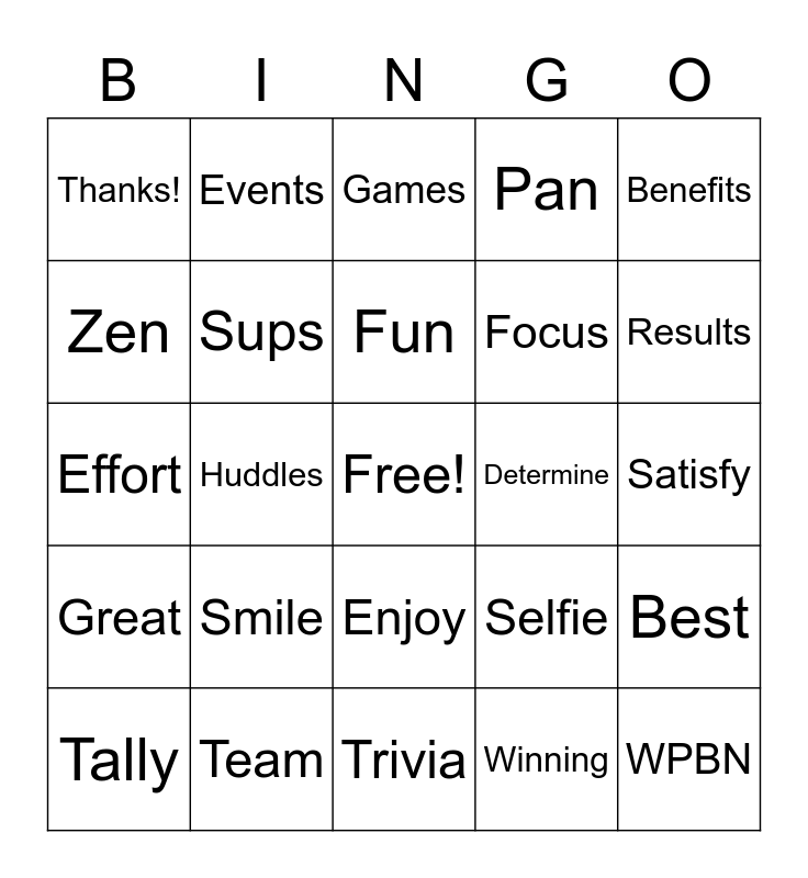 This bingo card has a free space and 27 words: Selfie, Bingo, Focus, Trivia, Zen, Games, Events, Great, Determine, Best, Effort, Pan, Tally, Team, Results, ACSR, Sups, Fun, Smile, Thanks!, Satisfy, Winning, Huddles, WPBN, Enjoy, Benefits and Goals.