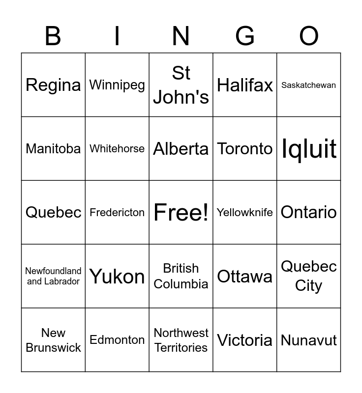 This bingo card has a free space and 26 words: British Columbia, Victoria, Alberta, Edmonton, Saskatchewan, Regina, Manitoba, Winnipeg, Ontario, Ottawa, Toronto, Quebec, Quebec City, New Brunswick, Fredericton, Nova Scotia, Halifax, Newfoundland and Labrador, St John's, Nunavut, Iqluit, Northwest Territories, Yellowknife, Yukon, Whitehorse and Canada.