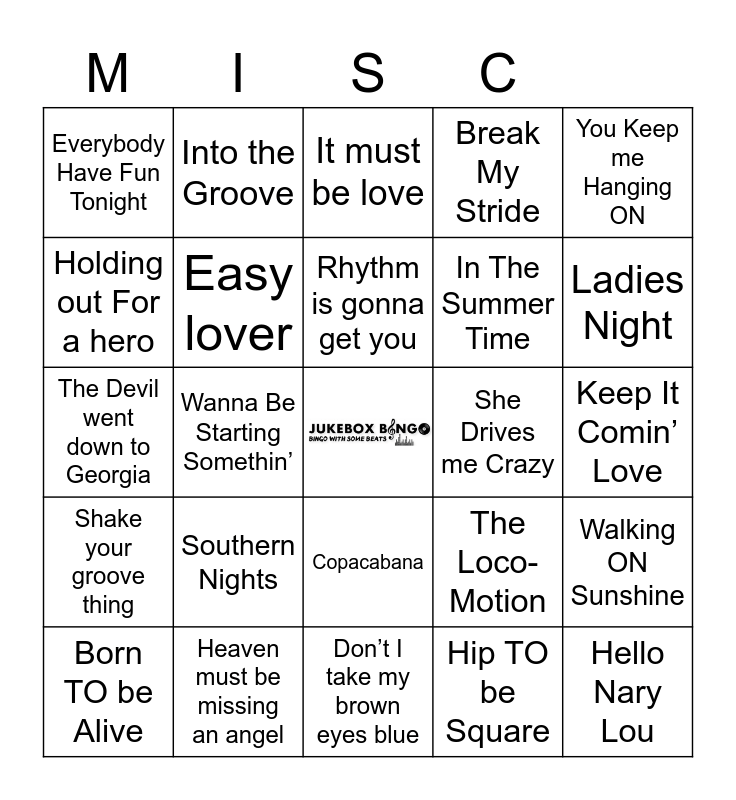 This bingo card has a free space and 49 words: Morning train, Hello Nary Lou, RhineStone Cowboy, Don’t I take my brown eyes blue, Southern Nights, I’m So excited, Into the Groove, Freeway of Love, Holding out For a hero, Conga!, Easy lover, Break My Stride, Walking ON Sunshine, The Loco-Motion, Tell it to my heart, How will I know, Rhythm is gonna get you, She Drives me Crazy, Walk The Dinosaur, You Keep me Hanging ON, Wanna Be Starting Somethin’, Hip TO be Square, Everybody Have Fun Tonight, In The Summer Time, Rock The Boat, Ladies Night, Born TO be Alive, Lady Marmalade, Copacabana, Shake your groove thing, Knock on wood, I was made for Dancin’, Working my way back to you babe, Disco Duck, Heaven must be missing an angel, (Every time I turn around) Back in Love, Gett Off, Mr.Big Stuff, Keep It Comin’ Love, Baby I’m Burning, Every which way but loose, Why have you left the one you left me for, (If loving you is wrong) I don’t want to be right, Coca Cola Cowboy, The Devil went down to Georgia, It must be love, Take this job and shove it, Sleeping single in a double bed and Say you’ll stay until tomorrow.