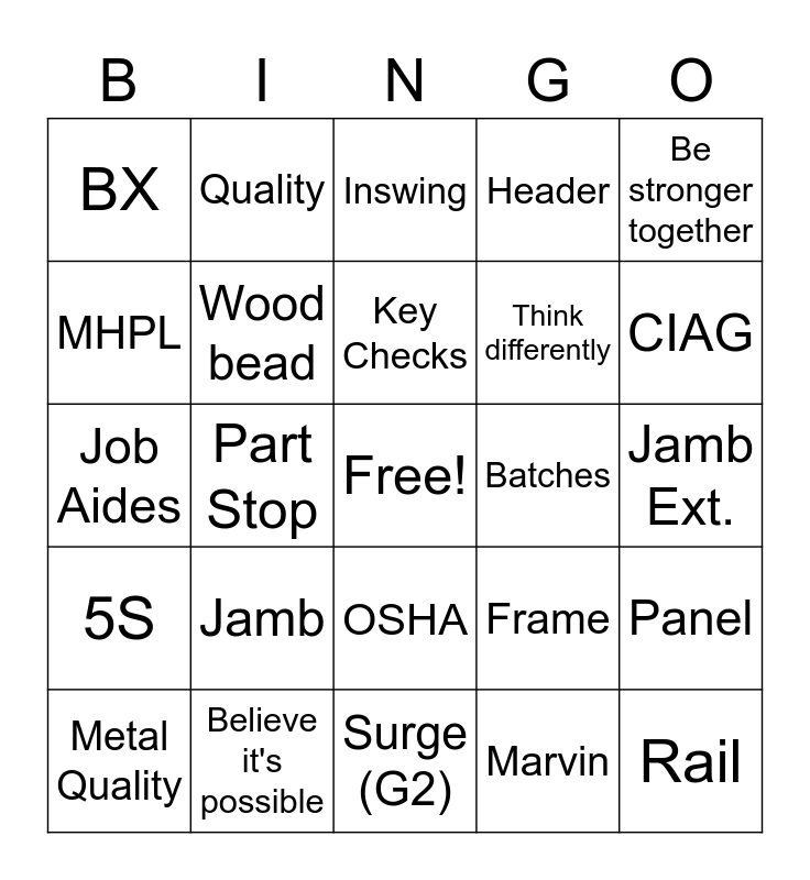 This bingo card has a free space and 53 words: Stile, Rail, SDL, Marvin, Jamb, Sill, Quality, Safety, MHPL, DAP, Wood bead, Wood Quality, Panel, Frame, Glass, Metal Quality, Key Checks, Batches, Do the right thing, Be stronger together, Part Stop, Golf cart, Think differently, BX, Raise the bar, Believe it's possible, Gaskets, Sealant Patterns, Finish, CIAG, Gratitude, PPE, Yellow Rose, Ripley, Teamwork, VPP, Header, Surge (G2), Inswing, Outswing, Slider, Accessories, Jamb Ext., Special Species, Signature Products, OSHA, Lites, SWP, Job Aides, 5S, Safety Star, Imagine and create better ways of living and 40th anniversary.