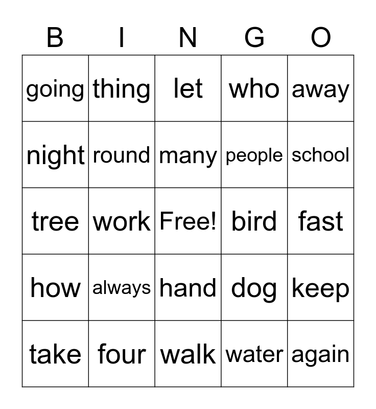 This bingo card has a free space and 24 words: always, four, many, take, away, going, night, thing, bird, hand, people, tree, dog, keep, round, water, fast, let, school, work, again, how, who and walk.