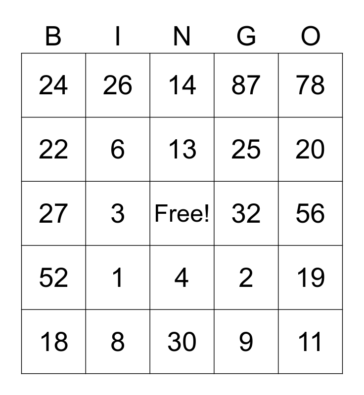 This bingo card has a free space and 24 words: 1, 8, 13, 18, 78, 24, 22, 26, 32, 4, 25, 27, 2, 19, 6, 9, 56, 14, 20, 3, 11, 52, 87 and 30.
