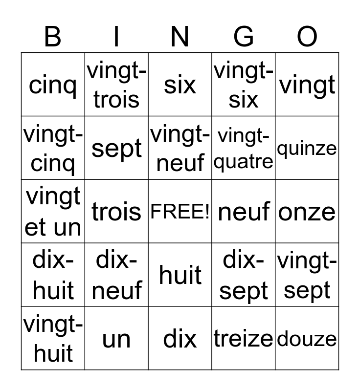 This bingo card has a free space and 30 words: un, deux, trois, quatre, cinq, six, sept, huit, neuf, dix, onze, douze, treize, quatorze, quinze, seize, dix-sept, dix-huit, dix-neuf, vingt, vingt et un, vingt-deux, vingt-trois, vingt-quatre, vingt-cinq, vingt-six, vingt-sept, vingt-huit, vingt-neuf and trente.
