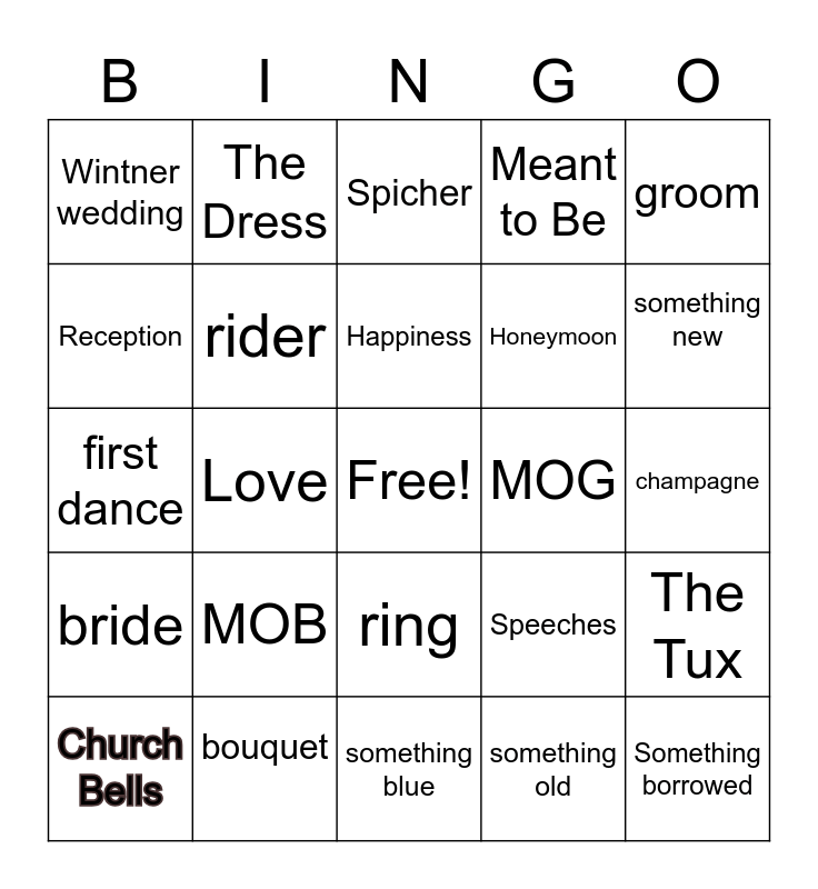 This bingo card has a free space and 29 words: Church Bells, Ceremony, Love, Proposal, Wintner wedding, Spicher, rider, MOB, MOG, bouquet, champagne, Something borrowed, something blue, something old, something new, the veil, ring, bride, groom, first dance, Speeches, Cake, Honeymoon, Reception, Meant to Be, The Dress, The Tux, Happiness and The Vows.
