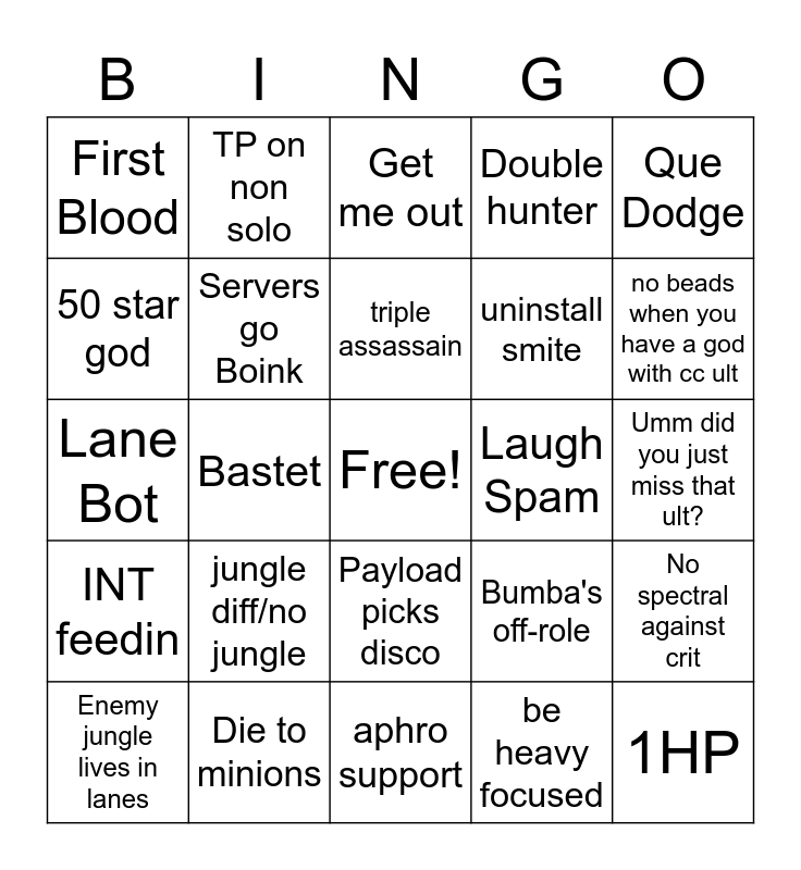 This bingo card has a free space and 73 words: Unsuitble god in non-meta roll, GG F6, First Blood, OBJ Steal, D/C, LMAO ILL SIT IN BASE, INT feedin, Questionable build, Bumba's off-role, ADC split push 0 wards, VGS SPAM, Get fire then die instantly at back camps, Servers go Boink, Umm did you just miss that ult?, Fatfingerd, TP on non solo, aphro support, 50 star god, Where'd they go?, Laugh Spam, triple assassain, Double hunter, Que Dodge, Loki, Enemy jungle lives in lanes, 0 ward player (not fox), Ver Vex, Pentakill, QuadraKill, towerdive when death obvious, Die to minions, Winions yaay!, ADC Cant auto, Antiheal 4th item, Bastet, Throwing an easy lead, Instalock, "noob", 1HP, Escape with 1HP, be heavy focused, jungle diff/no jungle, Ninja Turtle, Avatar skin, Non english speaking, uninstall smite, Get me out, Wrong Lane, Spam typing while team is losing, Lane Bot, Shadowsteal shurikan, spamming retreat when obvious, FG scorp still up at 20, slyvanus manakins, Ganesha Kill, Fox blames panic at the keyboard, Hollow Screams, Payload picks disco, Hollow goes adc jungle and slaps, Damage Cabraken, Fox plays like a god one game and is trash next, Thorns Kill, hit tyr/herc combo into tower, no beads when you have a god with cc ult, ARTIO SOLO, Pyload starts vgs instead of speaking, Janus Snipe, What is that build, No spectral against crit, obow first item, Siren Passes hollow, payloads dogs and fox needs a smoke.