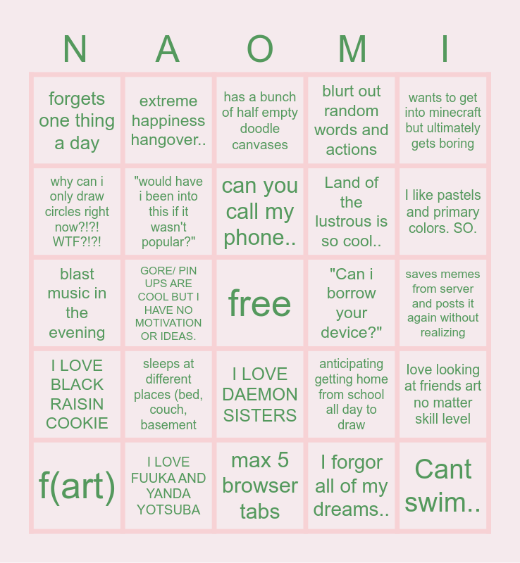 This bingo card has a free space and 24 words: f(art), sleeps at different places (bed, couch, basement, can you call my phone.., I forgor all of my dreams.., wants to get into minecraft but ultimately gets boring, forgets one thing a day, extreme happiness hangover.., has a bunch of half empty doodle canvases, "Can i borrow your device?", saves memes from server and posts it again without realizing, blast music in the evening, "would have i been into this if it wasn't popular?", anticipating getting home from school all day to draw, Iove looking at friends art no matter skill level, why can i only draw circles right now?!?! WTF?!?!, I LOVE FUUKA AND YANDA YOTSUBA, max 5 browser tabs, blurt out random words and actions, I like pastels and primary colors. SO., I LOVE BLACK RAISIN COOKIE, GORE/ PIN UPS ARE COOL BUT I HAVE NO MOTIVATION OR IDEAS., I LOVE DAEMON SISTERS, Land of the lustrous is so cool.. and Cant swim...