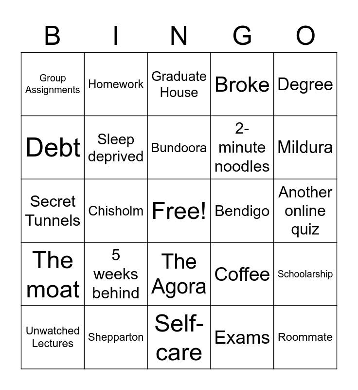 This bingo card has a free space and 33 words: Menzies, Glenn, Chisholm, NASA, The moat, Sleep deprived, Degree, Unwatched Lectures, Homework, Motivation, Bundoora, Graduate House, Barnes Way, Charles Joseph La Trobe, Bendigo, Mildura, Shepparton, Secret Tunnels, 5 weeks behind, Coffee, The Agora, The terraces, Group Assignments, Another online quiz, Self-care, Roommate, Broke, 2-minute noodles, Debt, Schoolarship, C's get degrees, Exams and La Trobe Uni Love Letters.