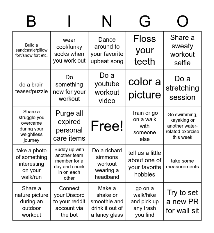 This bingo card has a free space and 34 words: wave at five people on your walk, go on a walk/hike and pick up any trash you find, go for a walk/run/hike 3x a week, reach your hydration goal 3 days in a row, take a photo of something interesting on your walk/run, Do something new for your workout, Share a sweaty workout selfie, Share a nature picture during an outdoor workout, wear cool/funky socks when you work out, Achieve a PR, Do a youtube workout video, Dance around to your favorite upbeat song, Find a new healthy snack, Walk more steps than yesterday, Train or go on a walk with someone else, Do a stretching session, Connect your Discord to your reddit account via the bot, Share a struggle you overcame during your weightless journey, Buddy up with another team member for a day and check in on each other, tell us a little about one of your favorite hobbies, Do a richard simmons workout wearing a headband, Walk/run/hike a path you’ve never taken before, Build a sandcastle/pillow fort/snow fort etc., Go swimming, kayaking or another water-related exercise this week, Make a shake or smoothie and drink it out of a fancy glass, Try to set a new PR for wall sit, Floss your teeth, Make a bird feeder, color a picture, do a brain teaser/puzzle, compliment someone, Purge all expired personal care items, take some measurements and take a progress photo.