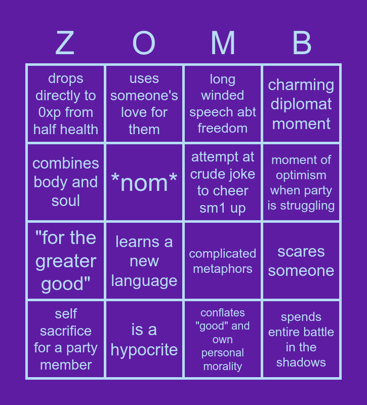 This bingo card has 16 words: is a hypocrite, scares someone, long winded speech abt freedom, drops directly to 0xp from half health, "for the greater good", uses someone's love for them, complicated metaphors, conflates "good" and own personal morality, combines body and soul, *nom*, self sacrifice for a party member, charming diplomat moment, learns a new language, moment of optimism when party is struggling, attempt at crude joke to cheer sm1 up and spends entire battle in the shadows.