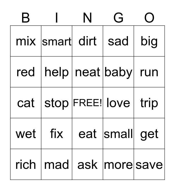 This bingo card has a free space and 24 words: fix, mad, neat, rich, big, mix, red, smart, love, eat, baby, cat, small, get, help, more, trip, dirt, run, stop, save, wet, sad and ask.