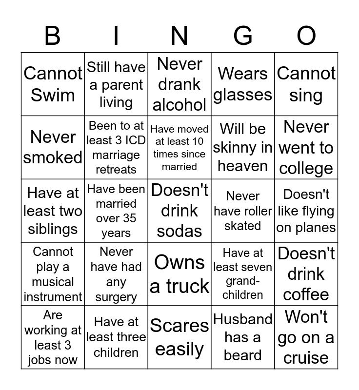 This bingo card has a free space and 24 words: Never have had any surgery, Have at least three children, Have moved at least 10 times since married, Are working at least 3 jobs now, Cannot sing, Cannot Swim, Never smoked, Still have a parent living, Never have roller skated, Owns a truck, Will be skinny in heaven, Have at least two siblings, Have at least seven grand-children, Doesn't drink coffee, Been to at least 3 ICD marriage retreats, Husband has a beard, Doesn't like flying on planes, Never drank alcohol, Never went to college, Have been married over 35 years, Won't go on a cruise, Cannot play a musical instrument, Wears glasses and Scares easily.