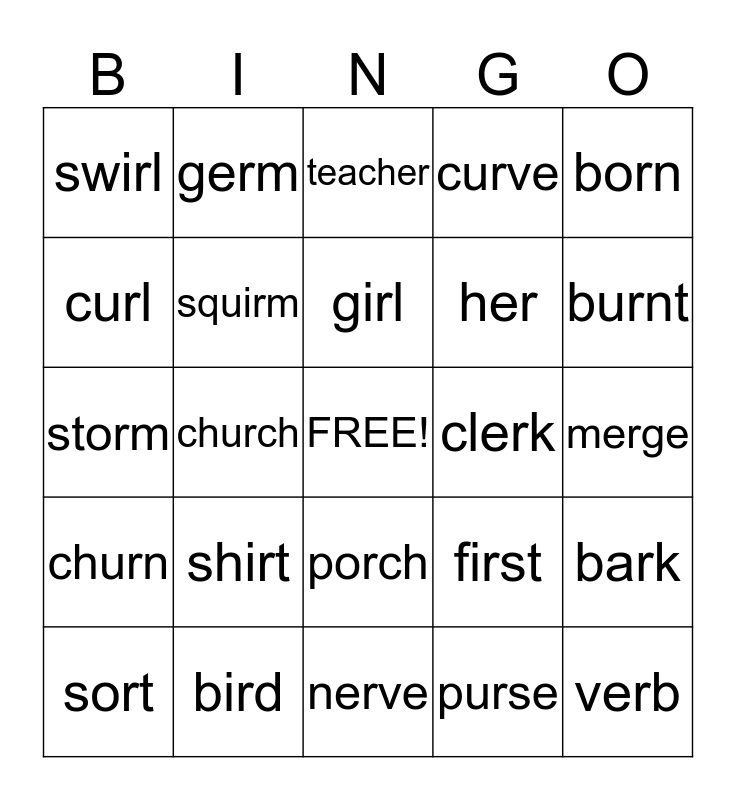 This bingo card has a free space and 44 words: turn, verb, part, sort, thirst, purse, teacher, farm, born, bird, curve, clerk, porch, shirt, blurt, nerve, park, storm, dirt, burnt, germ, carve, morning, swirl, fur, merge, march, fork, first, churn, verse, bark, sport, squirt, church, stern, arm, torn, girl, curl, her, chore, squirm and large.