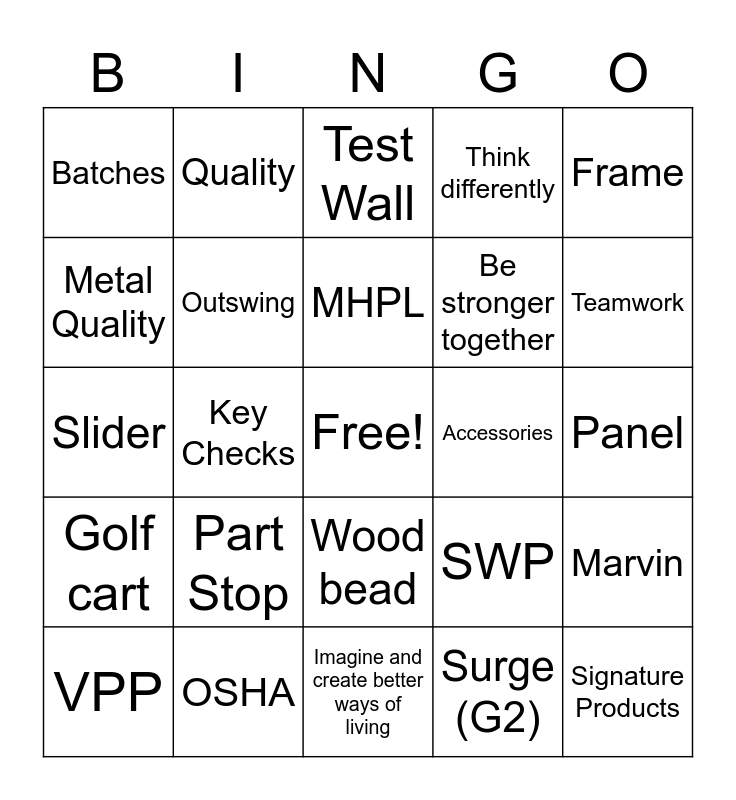 This bingo card has a free space and 63 words: Stile, Rail, SDL, Marvin, Jamb, Sill, Quality, Safety, MHPL, DAP, Wood bead, Wood Quality, Panel, Frame, Glass, Metal Quality, Key Checks, Batches, Do the right thing, Be stronger together, Part Stop, Golf cart, Think differently, BX, Raise the bar, Believe it's possible, Gaskets, Sealant Patterns, Finish, CIAG, Gratitude, PPE, Yellow Rose, Ripley, Teamwork, VPP, Header, Surge (G2), Inswing, Outswing, Slider, Accessories, Jamb Ext., Special Species, Signature Products, OSHA, Lites, SWP, Job Aides, 5S, Safety Star, Imagine and create better ways of living, 40th anniversary, IZ/zone, Dust Blocks, Test Wall, Evident Quality, Archtop, MPS, L&S, Transom, Bifold and Commercial.
