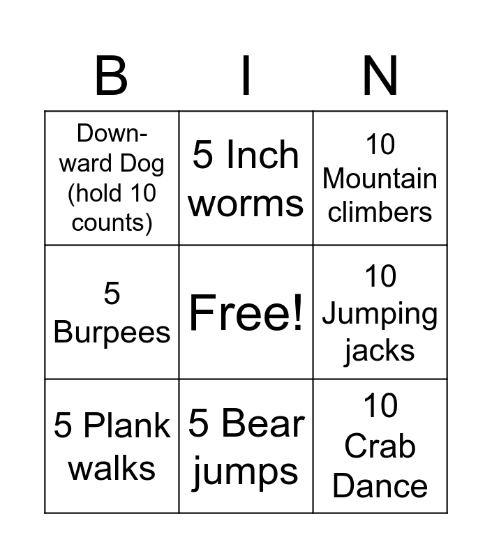 This bingo card has a free space and 8 words: 10 Jumping jacks, 10 Mountain climbers, 5 Inch worms, 5 Plank walks, Down-ward Dog (hold 10 counts), 10 Crab Dance, 5 Burpees and 5 Bear jumps.
