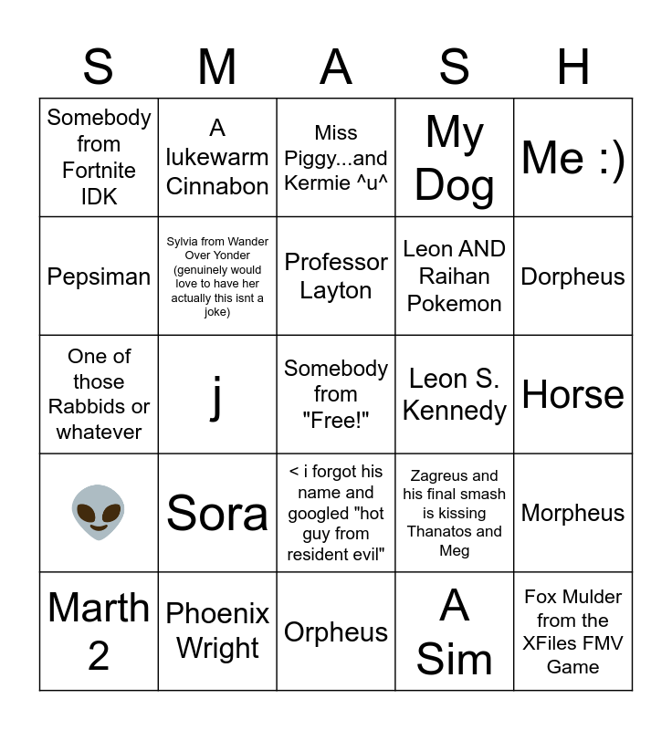 This bingo card has a free space and 24 words: Sora, Phoenix Wright, Professor Layton, Marth 2, Me :), Somebody from Fortnite IDK, Pepsiman, A lukewarm Cinnabon, Leon S. Kennedy, < i forgot his name and googled "hot guy from resident evil", Leon AND Raihan Pokemon, One of those Rabbids or whatever, Zagreus and his final smash is kissing Thanatos and Meg, Morpheus, Sylvia from Wander Over Yonder (genuinely would love to have her actually this isnt a joke), A Sim, Horse, Miss Piggy...and Kermie ^u^, Dorpheus, j, Fox Mulder from the XFiles FMV Game, 👽, My Dog and Orpheus.