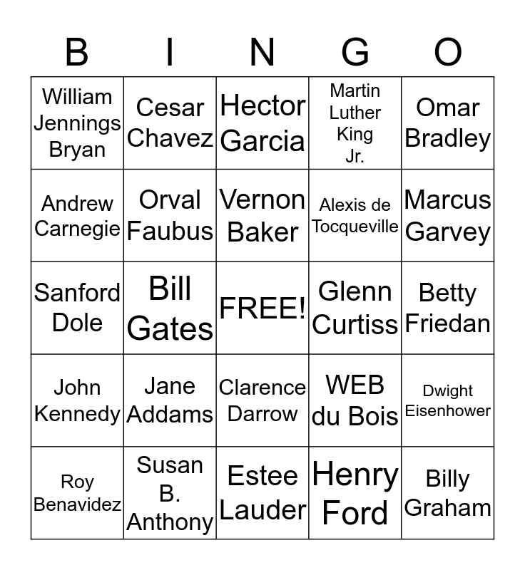 This bingo card has a free space and 24 words: Jane Addams, Susan B. Anthony, Vernon Baker, Roy Benavidez, Omar Bradley, William Jennings Bryan, Andrew Carnegie, Cesar Chavez, Glenn Curtiss, Clarence Darrow, Alexis de Tocqueville, Sanford Dole, WEB du Bois, Dwight Eisenhower, Orval Faubus, Henry Ford, Betty Friedan, Hector Garcia, Marcus Garvey, Bill Gates, Billy Graham, John Kennedy, Martin Luther King Jr. and Estee Lauder.
