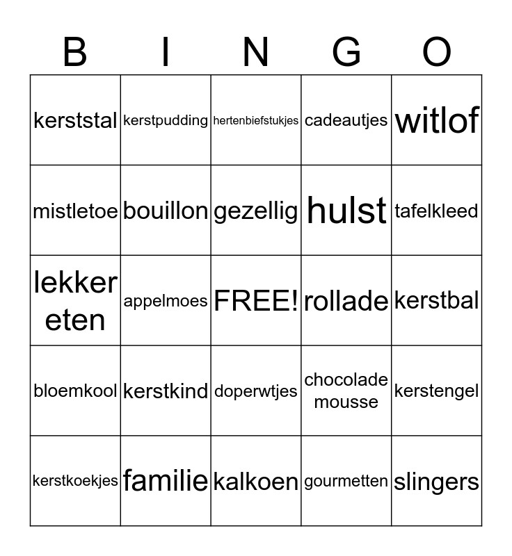 This bingo card has a free space and 31 words: kalkoen, kerstboom, appelmoes, stoofpeertjes, kerststal, hertenbiefstukjes, bouillon, chocolade mousse, rollade, gourmetten, kerstbal, slingers, lichtjes, kaarsen, tafelkleed, servetten, kerstengel, kerstkind, bloemkool, doperwtjes, witlof, konijn, kerstkoekjes, kerstpudding, hulst, mistletoe, cadeautjes, lekker eten, familie, gezellig and haardvuur.
