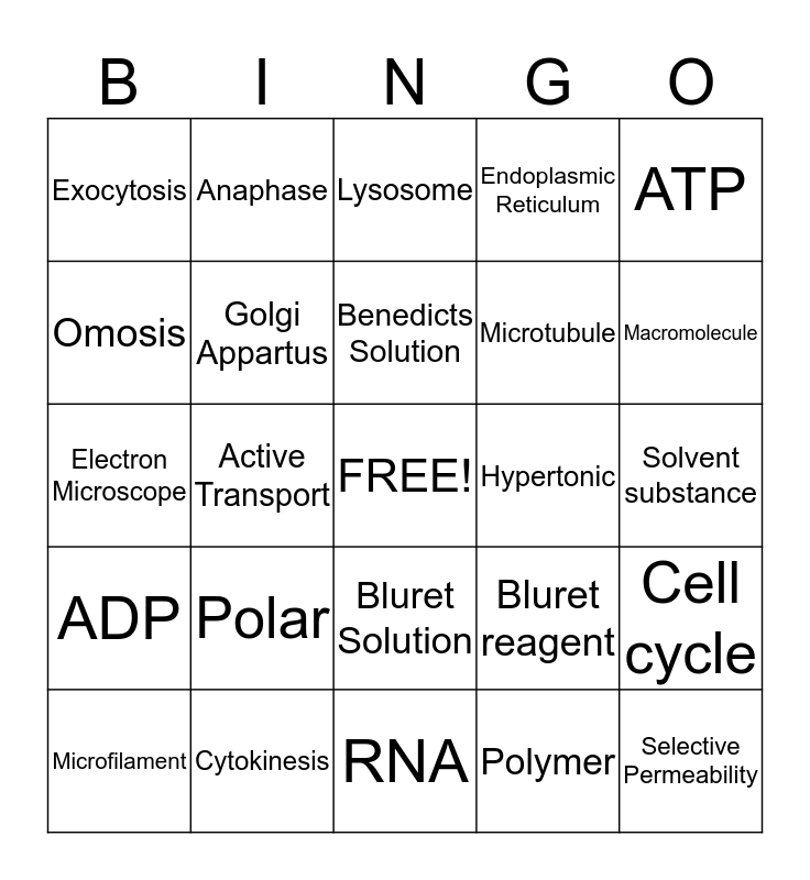 This bingo card has a free space and 24 words: Polar, Cytokinesis, Benedicts Solution, Microfilament, ATP, Exocytosis, Omosis, Anaphase, Hypertonic, Bluret Solution, Microtubule, Electron Microscope, Bluret reagent, Cell cycle, Golgi Appartus, Polymer, Solvent substance, Lysosome, Macromolecule, Active Transport, Selective Permeability, ADP, Endoplasmic Reticulum and RNA.