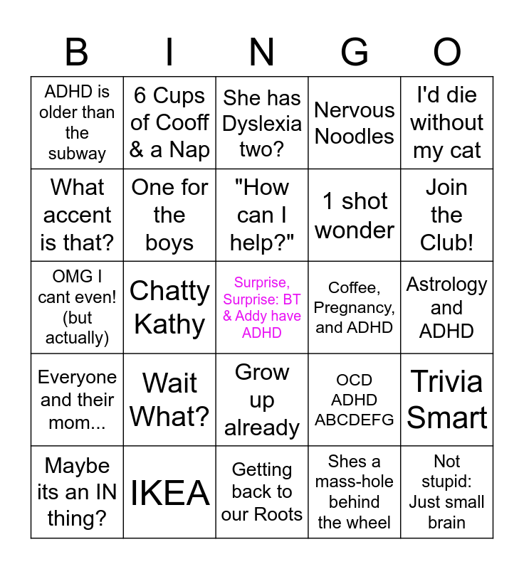 This bingo card has a free space and 28 words: Trivia Smart, BT is calling (again), 1 shot wonder, Shes a mass-hole behind the wheel, What accent is that?, She has Dyslexia two?, 6 Cups of Cooff & a Nap, Everyone and their mom..., Coffee, Pregnancy, and ADHD, Maybe its an IN thing?, OMG I cant even! (but actually), Nervous Noodles, IKEA, Getting back to our Roots, Join the Club!, Lucky #7, Wait What?, One for the boys, "How can I help?", Grow up already, ADHD is older than the subway, Adderall Addy, Not stupid: Just small brain, Chatty Kathy, Astrology and ADHD, OCD ADHD ABCDEFG, I'd die without my cat and GO EAT!.