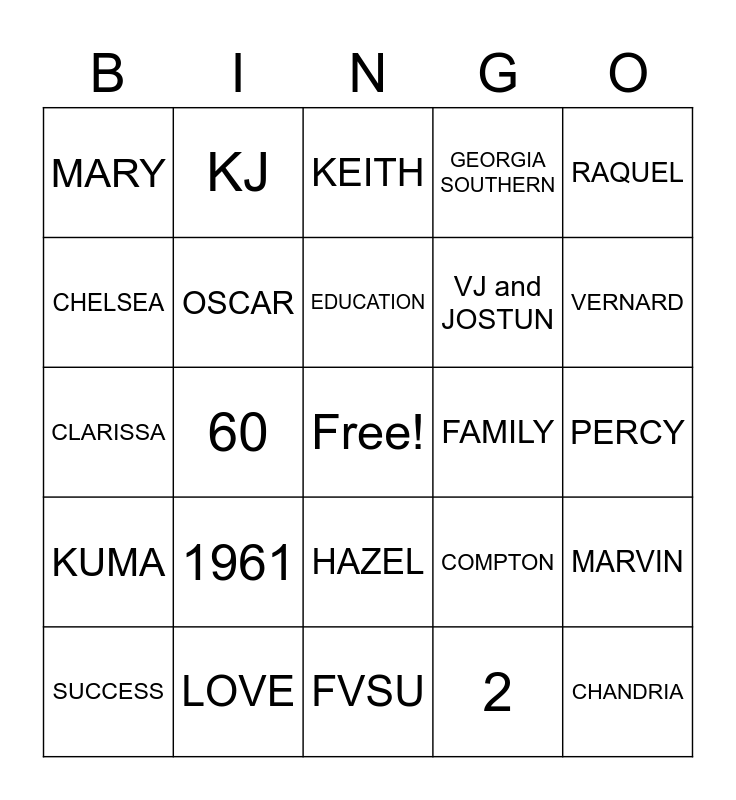 This bingo card has a free space and 24 words: 1961, LOVE, EDUCATION, SUCCESS, RAQUEL, MARY, CHELSEA, KJ, FAMILY, HAZEL, VJ and JOSTUN, CLARISSA, COMPTON, MARVIN, OSCAR, 2, PERCY, KEITH, VERNARD, 60, CHANDRIA, KUMA, GEORGIA SOUTHERN and FVSU.