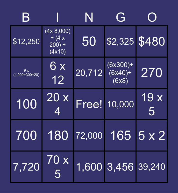 This bingo card has a free space and 25 words: 180, 1,600, 20,712, 7,720, $480, $12,250, 9 x (4,000+300+20), (4x 8,000) + (4 x 200) + (4x10), 10,000, 72,000, (6x300)+(6x40)+(6x8), 100, 165, 5 x 2, 6 x 12, 56 x 6, 19 x 5, 50, 270, 20 x 4, 39,240, 70 x 5, 700, $2,325 and 3,456.