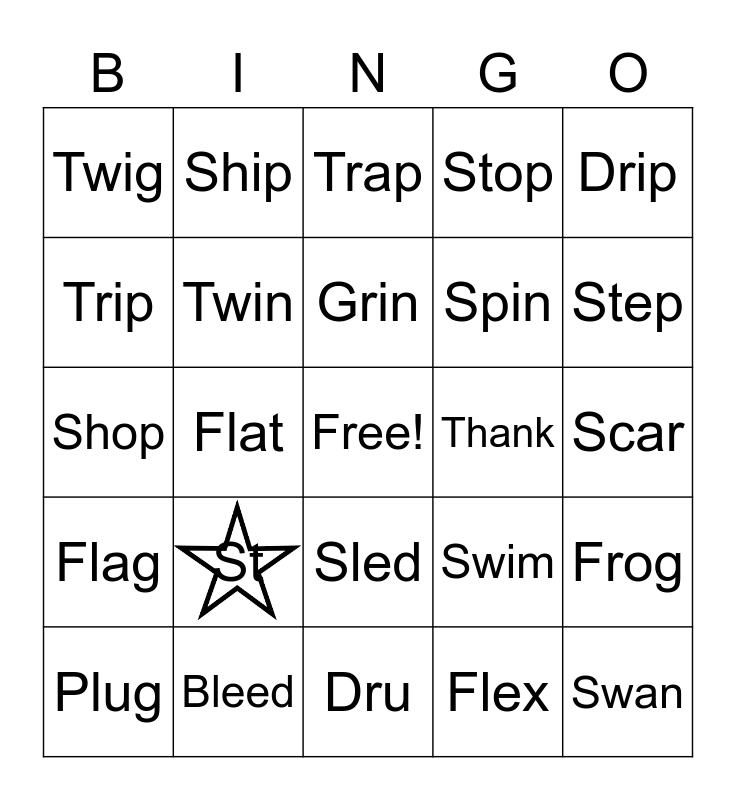 This bingo card has 1 images, a free space and 24 words: St, Bleed, Grin, Plug, Drip, Twig, Trip, Ship, Thank, Sled, Spin, Shop, Swim, Frog, Twin, Flex, Scar, Trap, Step, Flat, Swan, Flag, Stop and Dru.