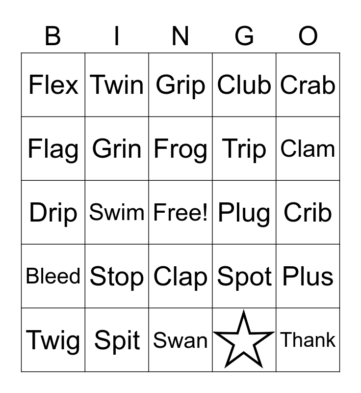 This bingo card has 1 images, a free space and 24 words: Stop, Swan, Frog, Twig, Crab, Flex, Flag, Twin, Plug, Clap, Trip, Drip, Spot, Plus, Grin, Step, Crib, Grip, Clam, Swim, Thank, Spit, Bleed and Club.